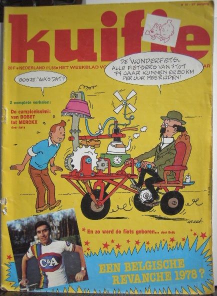 Op de voorkant staat een afbeelding met kuifje zelf en zonnebloem ' de wonderfiets '